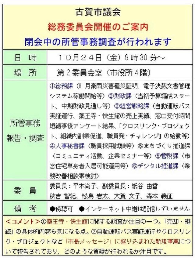 10月24日の9時30分から総務委員会が開催され、閉会中の所管事務調査が行われます。薬王寺・快生館などについて質疑が行われます。閉会中の所管事務調査は市民の皆さんになじみが薄いかもしれませんが大事な調査です。ご都合の良い方はぜひ傍聴してください。 #古賀市 #ぬま健司 #総務委員会 pic.x.com/xcnsHTfru5