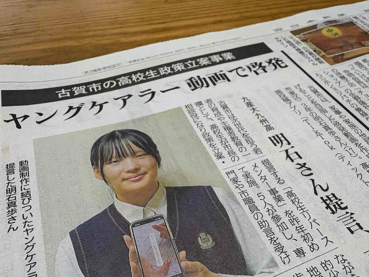高校生が市長の相談役となり、その感性で政策を提言する高校生リバースメンター。昨年度の提言を受けて高校生と共に実現したのが、ヤングケアラー啓発のTikTok動画の発信です。今日の西日本新聞朝刊が大きく報道。ありがとうございます! #古賀市 #高校生リバースメンター pic.x.com/kAmeRsjWUu x.com/tanabe_kazuki/…