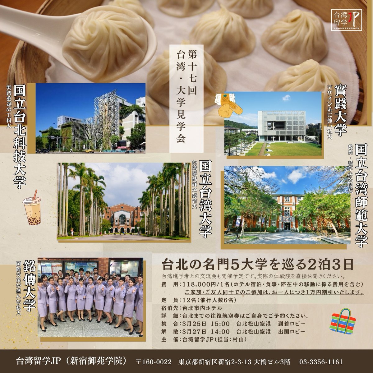 🎓台北の名門5大学を巡る見学会 参加者募集! 第17回 台湾・大学見学会 📅 3/25(火)〜27(木) 2泊3日 ✅訪問予定大学 ・国立台湾大学 ・国立台湾師範大学 ・国立台北科技大学 ・銘傳大学 ・実踐大学 #台湾留学 #海外進学 #台湾留学JP taiwanryugaku.jp/event-details/… pic.x.com/Cfi7UDz1ju