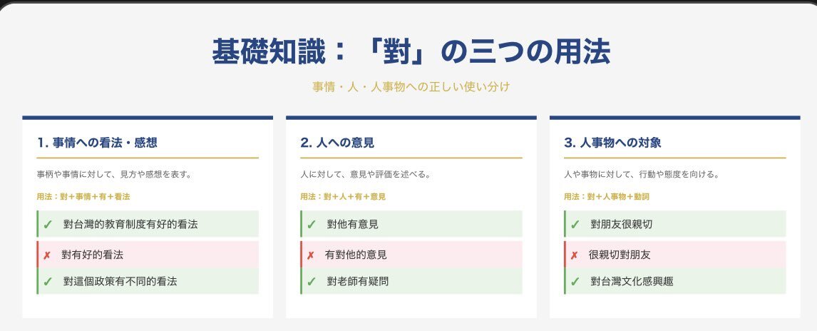 中国語文法】「對」の3つの用法🎓 「〜に対して」は語順が大事! ✅ 重要パターン 1.事柄への見方:對+事情+有+看法 2.人への意見:對+人+有+意見 3.対象への態度:對+人/物+形容詞/動詞 語尾に「對」を置かないように注意!🙅♂️ 詳しくはIG: @zairitaiwanhuayu #TOCFL #台湾留学 pic.x.com/GX9Z1zIP2m