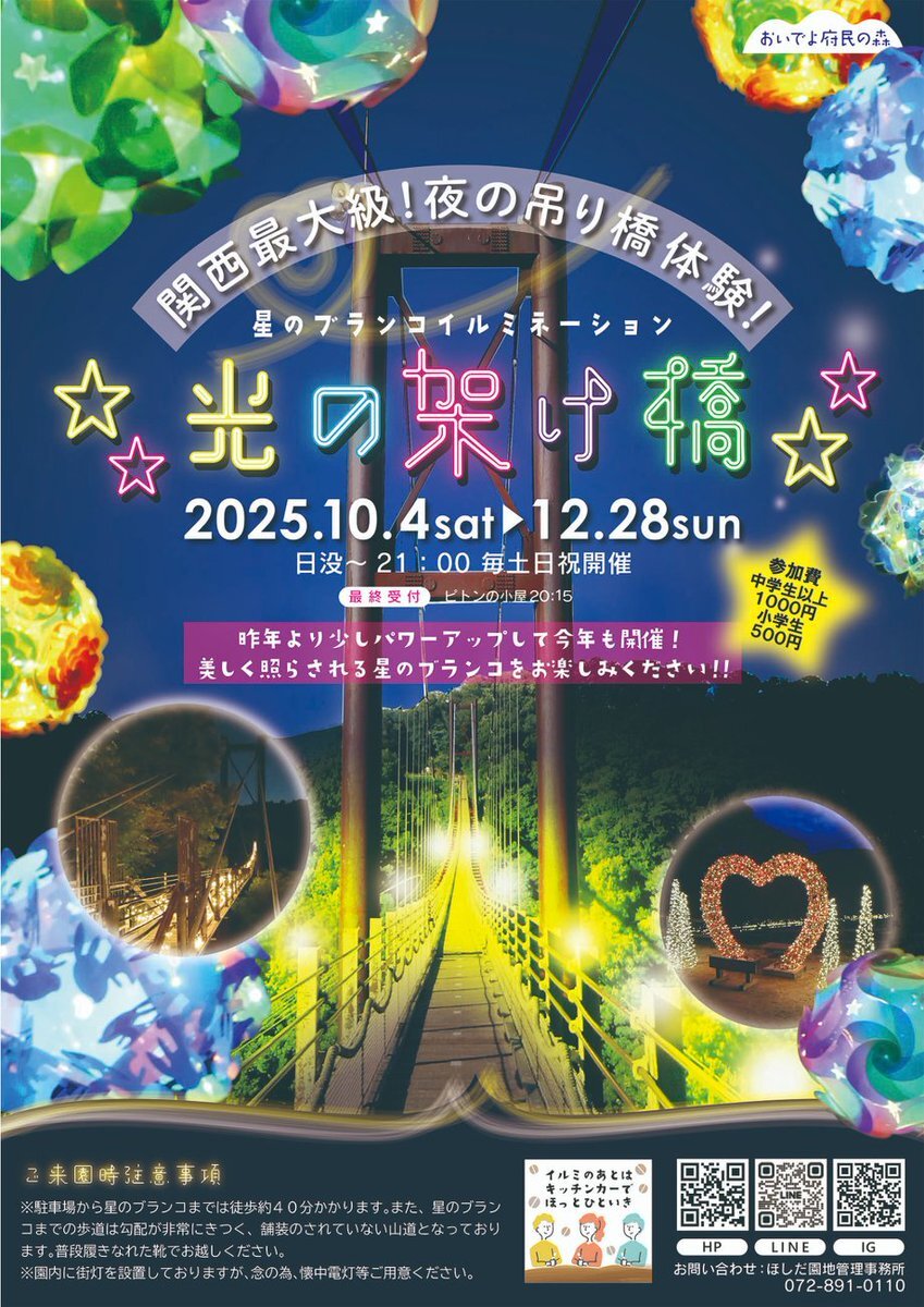 ~関西最大級❗️夜の吊り橋体験~ ✨🌃星のブランコイルミネーション「光の架け橋」🌃✨ 昨年よりパワーアップして今年も開催🎉 つり橋「星のブランコ」に約1万個のLEDを取り付け、 長さ280メートル高さ50メートルのつり橋が夜空に浮かび上がります⭐️ ぜひ幻想的な光の世界をご体感ください🌠