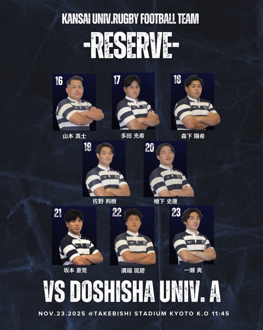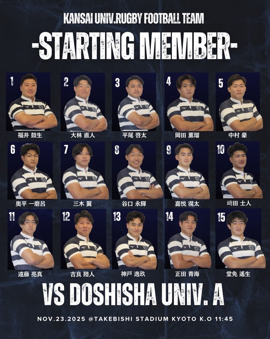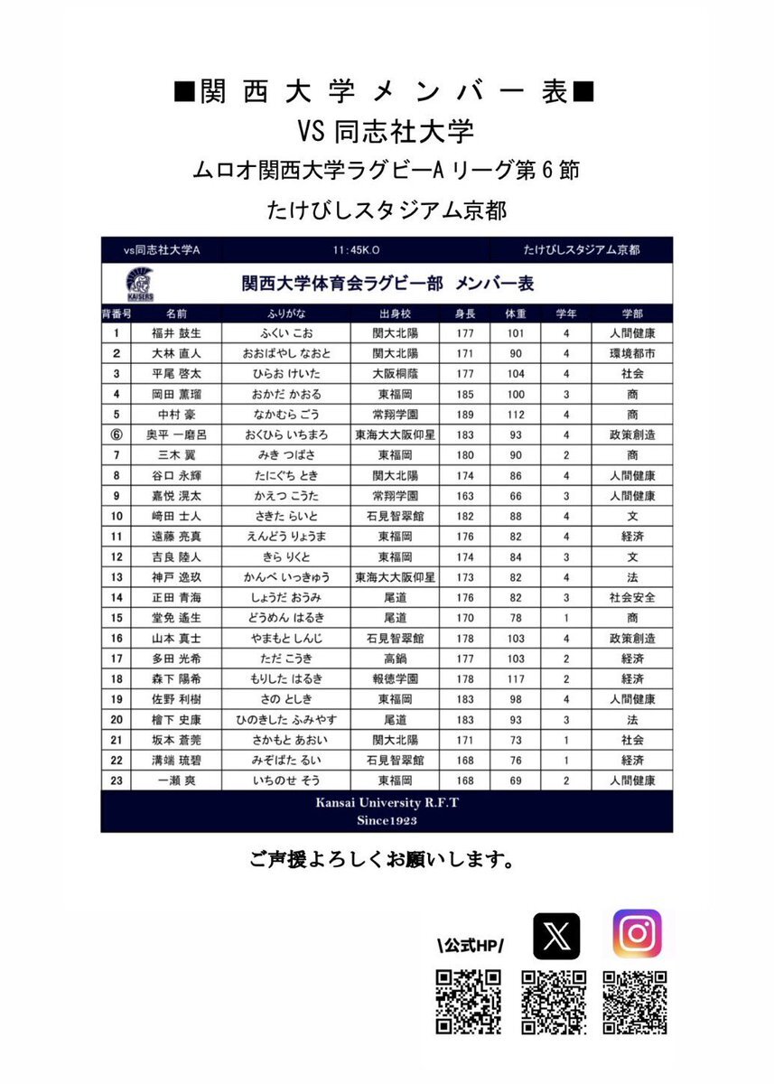 【ムロオ関西大学ラグビーAリーグ】 <試合メンバー表🏉> 11/23(日)たけびしスタジアム京都 11:45KO 同志社大学 vs 関西大学 #ラグビー #RUGBY #第6節 #大学ラグビー #頂上決戦 #同志社大学 #関西大学 #ムロオ関西大学ラグビーAリーグ pic.x.com/9bYp9wWSlT