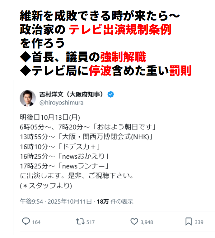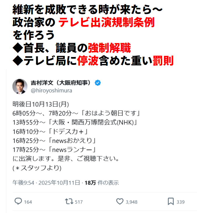 維新を成敗できる時が来たら 政治家のテレビ出演に厳しい規制条例を作ろう 強制解職 テレビ局にも重い罰則 #吉村洋文 #日本維新の会 #おはよう朝日です #newsおかえり #newsランナー #ドデスカ #朝日放送 #関西テレビ #名古屋テレビ x.com/hiroyoshimura/…