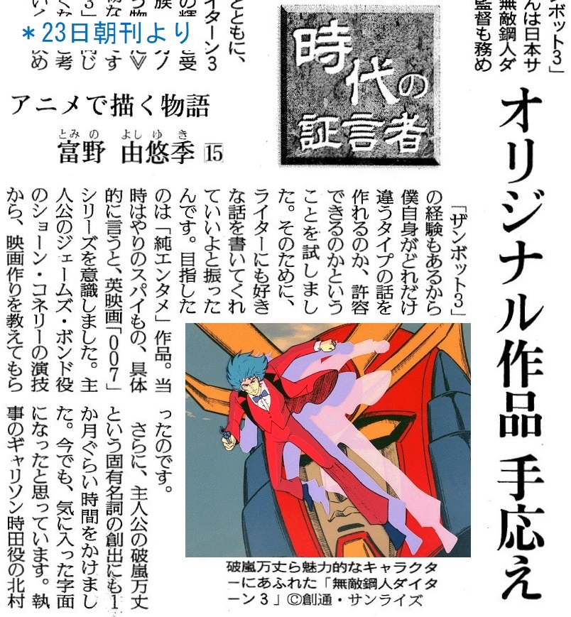 朝刊連載「時代の証言者 アニメで描く物語~富野由悠季さん」の15回目。巨大ロボットアニメの話が続きます。破嵐万丈を主人公とする「無敵鋼人ダイターン3」は「007」を意識した1話完結もの。自分に作家性があるかという挑戦でもあり、その心意気はあの名作にもつながっていきます。(創)