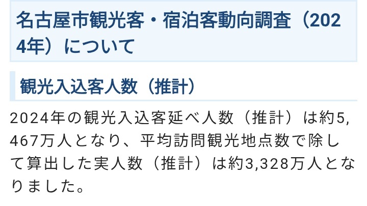 昨年の観光統計、名古屋市からも発表されていました。 宿泊率・インバウンド・観光消費額は増えたものの、全体の入込客数がコロナ前の5000万人まで回復するどころか、緩く減少しているのは気になります。 #名古屋 #名古屋市 令和6年名古屋市観光客・宿泊客動向調査 city.nagoya.jp/kankobunkakory… x.com/manaca371/stat…