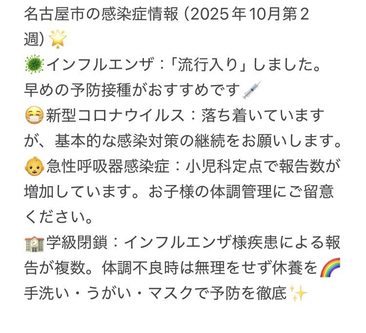 名城病院検査部より、名古屋市の感染症情報をお伝えします🍂 最新情報はこちら↓↓↓ city.nagoya.jp/kurashi/catego… #名古屋市 #感染症情報 #インフルエンザ #健康管理 pic.x.com/PisZX4OeAU