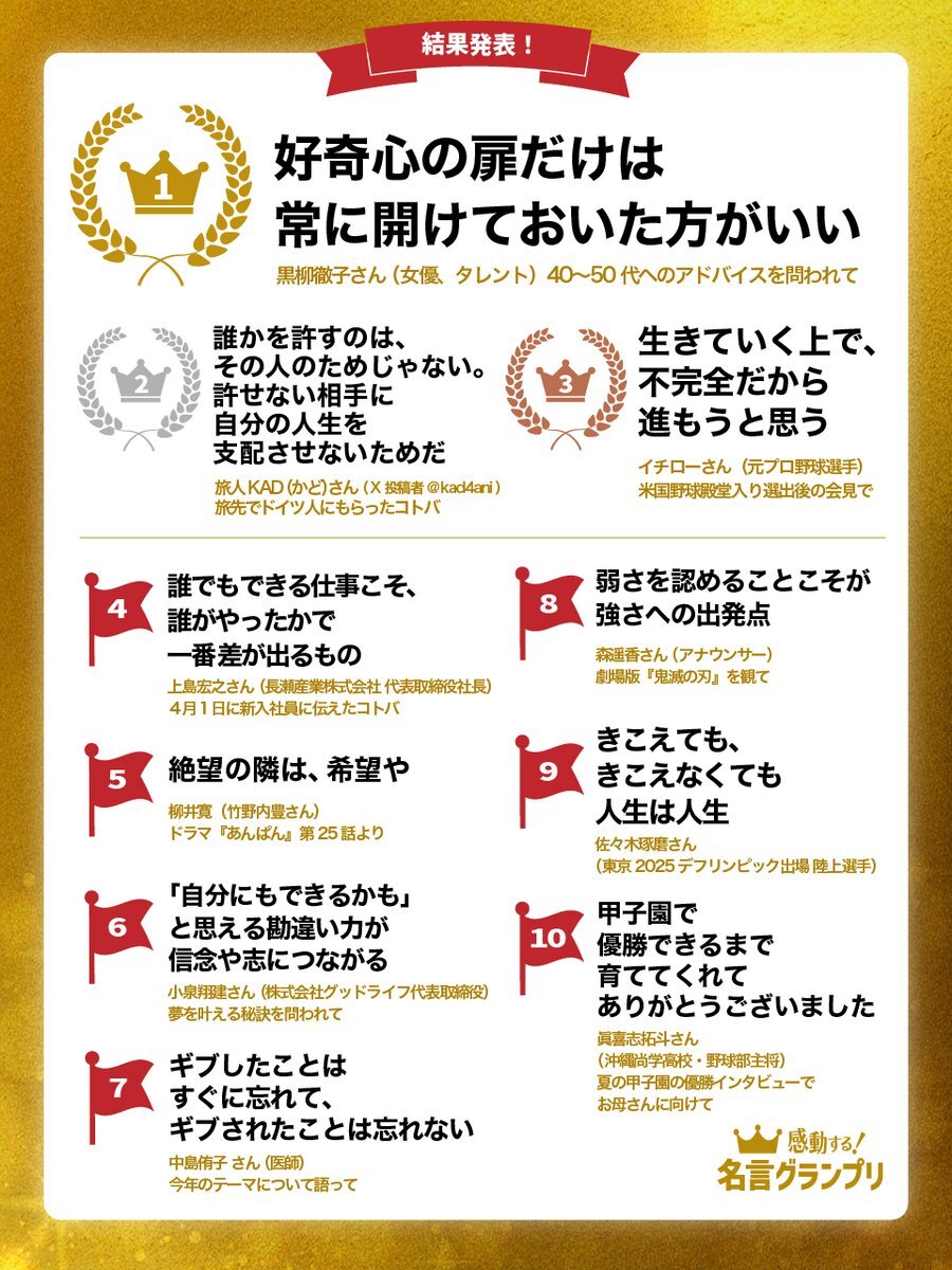 【プレゼント企画】 「感動する!名言グランプリ2025」 で感動の輪を広げよう✨ Amazonギフト券3,000円分を 抽選で10名さまにプレゼント! ◼︎応募方法 ① @meigen_gp をフォロー ②引用の発表ポストを 「#名言グランプリ2025」 のハッシュタグとともに引用リポスト ◼︎応募締切 12/16(火)23:59 x.com/meigen_gp/stat…