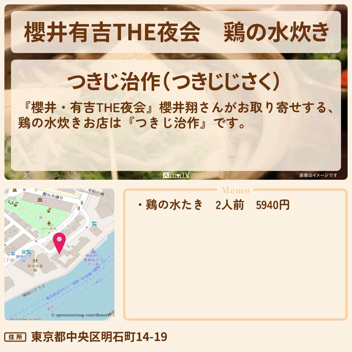 #櫻井有吉THE夜会 鶏の水炊き 櫻井翔さんがお取り寄せする 『つきじ治作』のお店情報を紹介 【住所】 東京都中央区明石町14-19 詳しくは👉 activitv.com/entry/the-yaka… #夜会 #櫻井翔 #有吉弘行 #野呂佳代 #荒川 #エルフ #上戸彩 #河合郁人 #向井慧 #パンサー #村竹ラシッド #平子祐希 #深澤辰哉 pic.x.com/199XKkC0L5