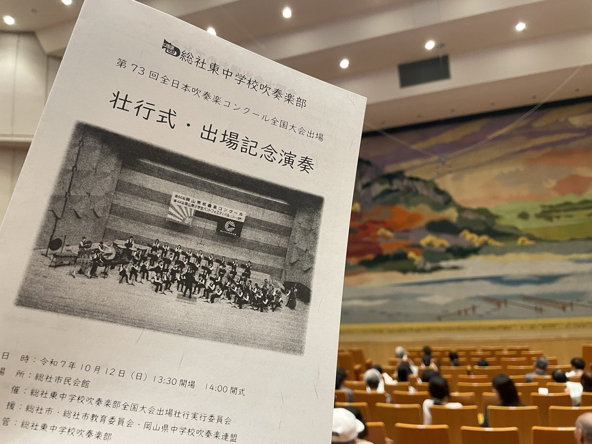 母校・総社東中吹奏楽部が第73回全日本吹奏楽コンクール全国大会へ🎺 31年ぶり通算9回目の快挙! 今日は市民会館で壮行式・記念演奏。 全国の舞台でも総社の音を響かせてきてください✨ #総社東中学校 #吹奏楽部 #全日本吹奏楽コンクール #総社市 pic.x.com/llAjA07VUK