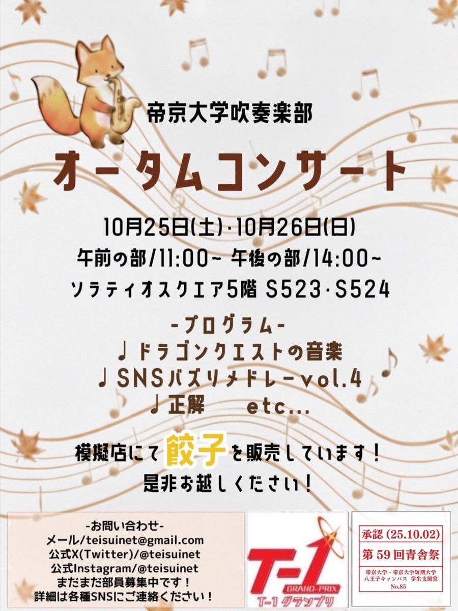 10月25日・26日の青舎祭にてオータムコンサートを行います🎶 SNSバズりメドレーやドラゴンクエストなど皆様に楽しんでいただけるような曲をたくさん準備しています✨✨ 模擬店では餃子も販売しているので、是非お越しください🥟♩ #帝京大学 #帝京大学八王子キャンパス #吹奏楽部 #帝京大学吹奏楽部 pic.x.com/wOzX5FHrB0