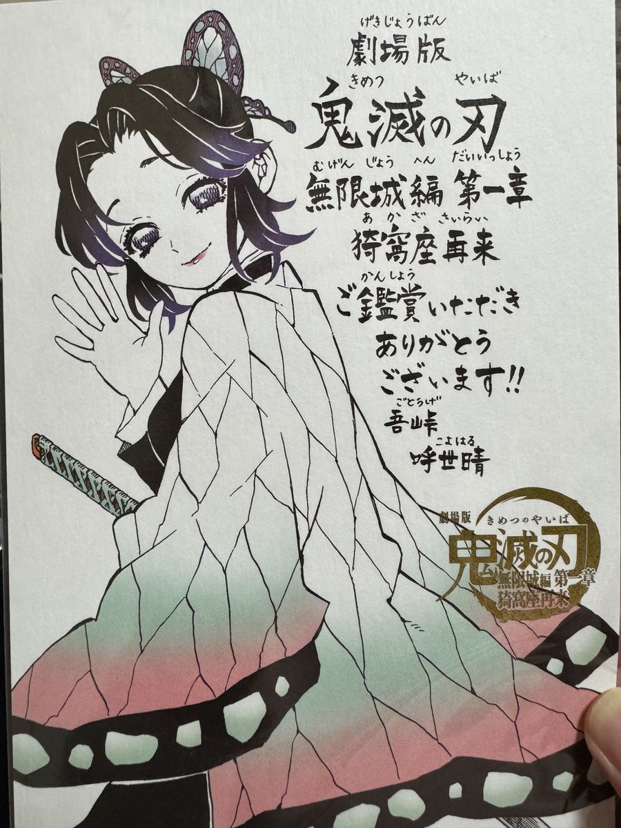 昨日は、劇場版「鬼滅の刃」無限城編 第一章 猗窩座再来3回目見に行きました (゚∀゚) 再来 入場者特典第十一弾 「原作者・吾峠呼世晴 描き下ろし鑑賞御礼メッセージボード」 #劇場版鬼滅の刃無限城編第一章猗窩座 #鬼滅の刃 #吾峠呼世晴 #胡蝶しのぶ #鬼滅の刃無限城編 #無限城編 #入場者特典 pic.x.com/8HthM6sBBs
