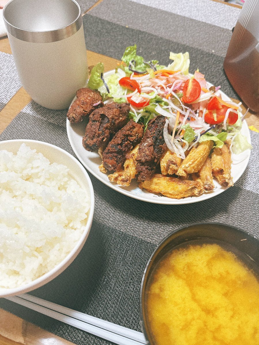 今日のご飯🍚 友達と飲み会🍻 手羽の唐揚げ🍗と素揚げ! ハムサラダ🥗🥦 少し生姜とか入れすぎて焦げたwww #呑み会 # pic.x.com/seFOJHwRqo