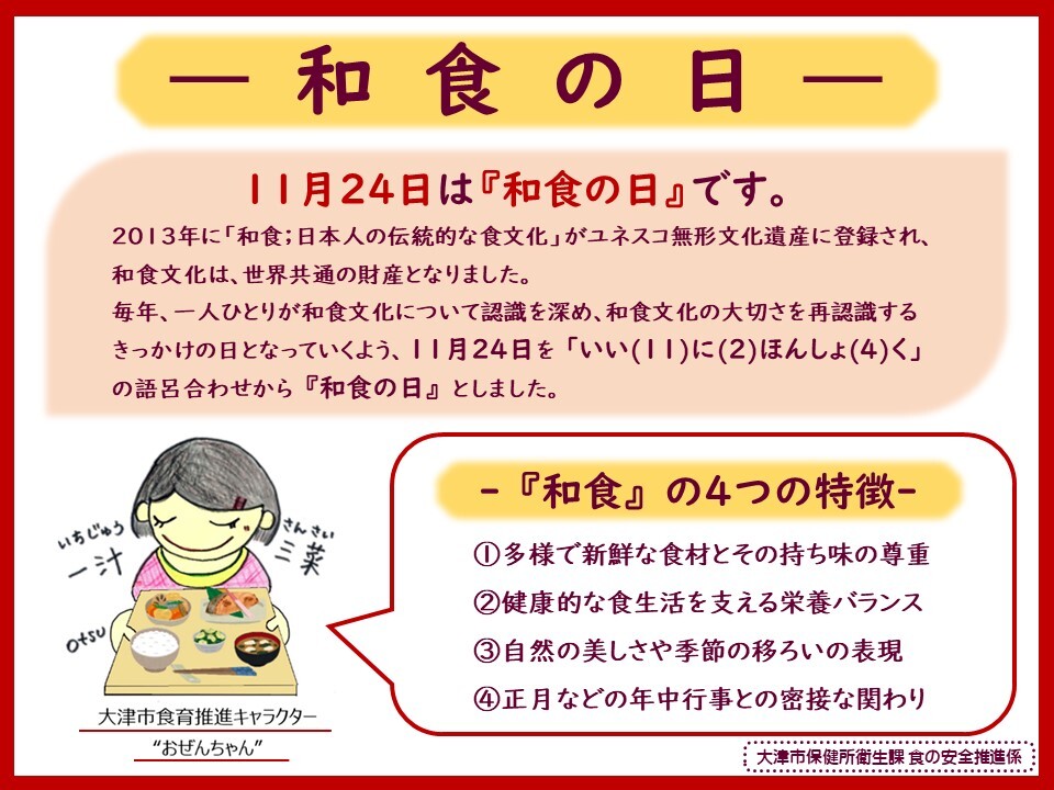 \11月24日(いい日本食の語呂合わせで) #和食の日 です/ #和食 は日本人の伝統的な食文化として #ユネスコ無形文化遺産 に登録されています。 今日をきっかけに、和食を美味しく楽しみ、 #和食文化 への認識を深め、和食文化の大切さを知っていただければと思います。 #大津市 #食育 pic.x.com/zUqTg6fRmD