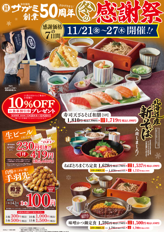 🎉#サガミ創業50周年 #冬の感謝祭🎉 東部メニューエリアの特別メニューをご紹介します! このエリアならではの味わいを、感謝祭 #限定価格 でご用意しました。 50周年だけの“特別な冬の美味しさ”をぜひお楽しみください❄️ ※東部メニューエリア限定でございます #和食麺処サガミ #感謝価格 #和食 pic.x.com/3UCmzV9dUE