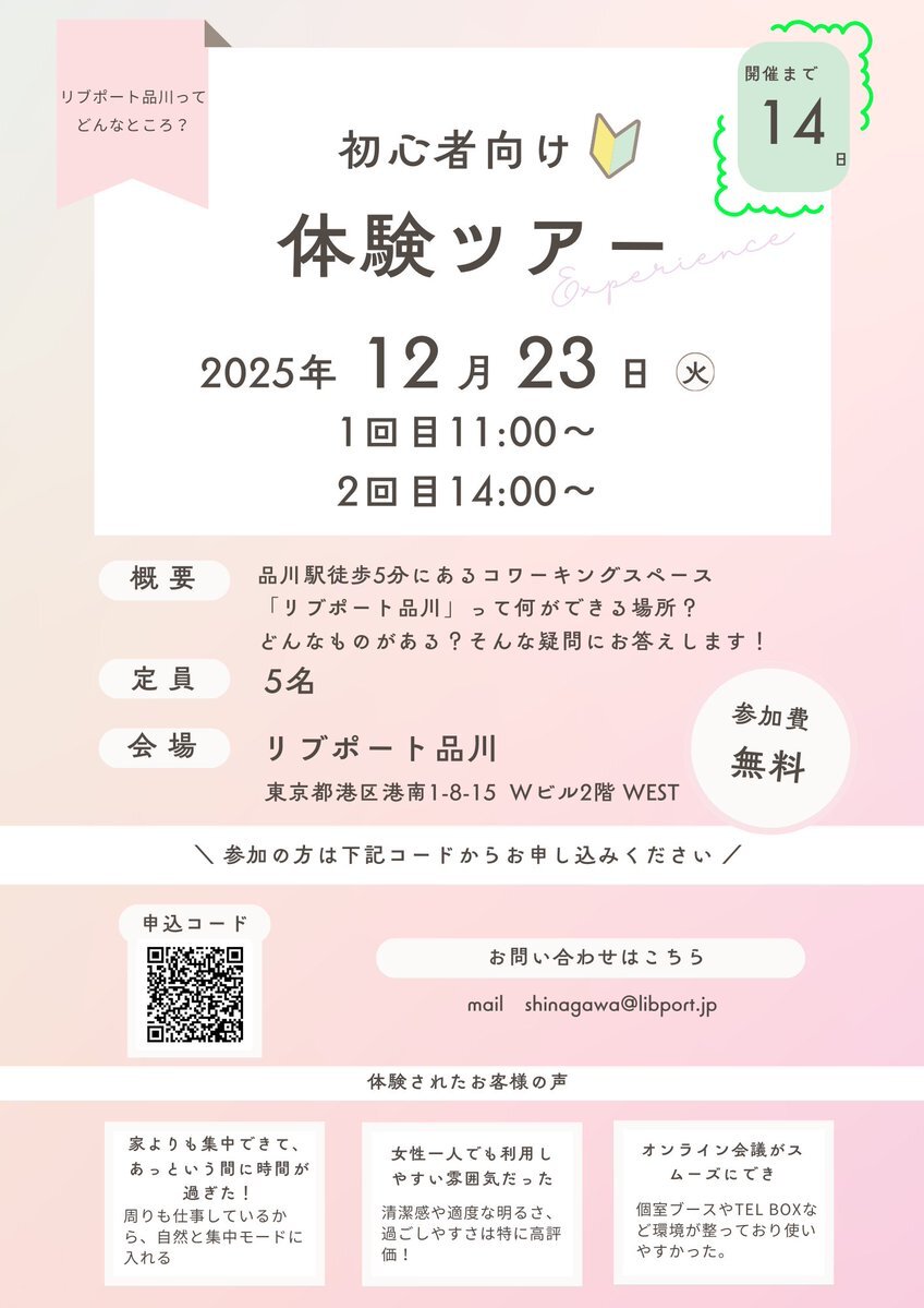 12/9(火) #浜松町 ☀️最高12℃/最低9℃ おはようございます! 本日もよろしくお願いします🐮 第三弾開催🎊 姉妹店の @libport47gawa で開催される #コワーキング体験ツアー ☃️ ぜひご参加ください♪ #シェアオフィス #品川駅 #コワーキングスペース #ワークスペース #オフィス #イベント #体験 pic.x.com/jK8Kmvsvxq