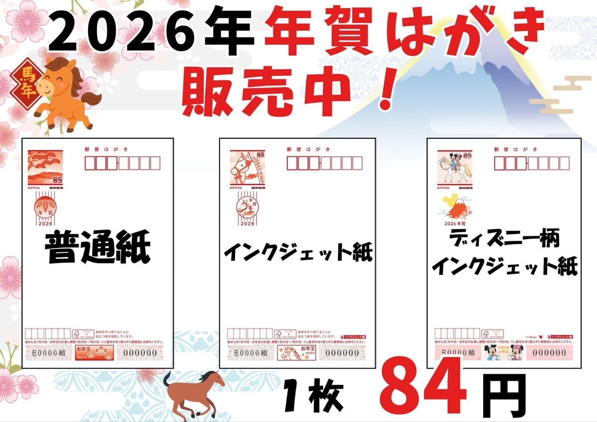 🐎2026年の年賀はがき販売中🐎 無地の年賀はがき入荷しました❗️ 1枚 84円(普通紙・インク・ディズニー) #絵付き年賀はがき は1枚140円 40種類の王道の縦型デザインから選べます♪ 皆様のご来店をお待ちしてます⭐️ ☎️03-5421-2261 #企業公式冬のフォロー祭り #年賀はがき #年賀状 #午年 #品川駅 pic.x.com/PlrGCEQ0V0