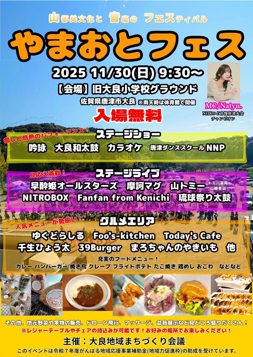 【やまおとフェス2025】 11/30(日)9:30〜16:00 [会場] 旧大良小学生グラウンド maps.app.goo.gl/2tUcKNpCV8hhzf… [LIVE] 早酔姫オールスターズ 摩訶マグ 山トミー(トミー富岡×山崎幸治) NITROBOX Fanfan from Kenichi 琉球祭り太鼓 #唐イベ 唐津イベント情報WEB karatsuevent.jimdofree.com pic.x.com/8Py2MoNlBx