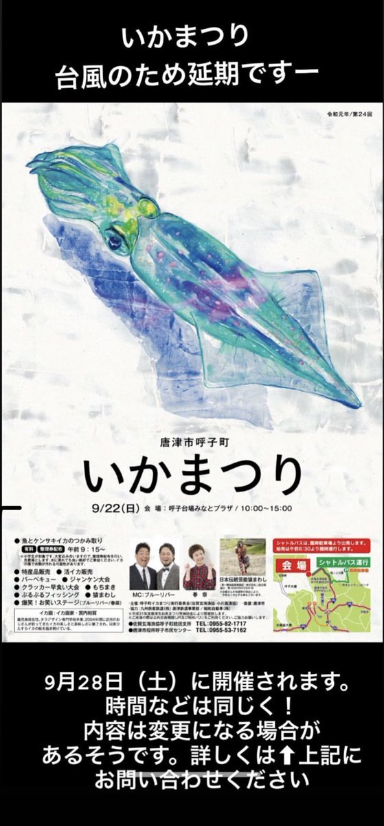 #佐賀県唐津市呼子町 で、開催予定の【#いかまつり】は、台風のため、9月28日(土)に延期されるとの事です。 お間違いのない様にお気を付けてくださいませ❗️ #唐津 #karatsu #呼子 #唐イベ pic.x.com/rEjdo6E7zk