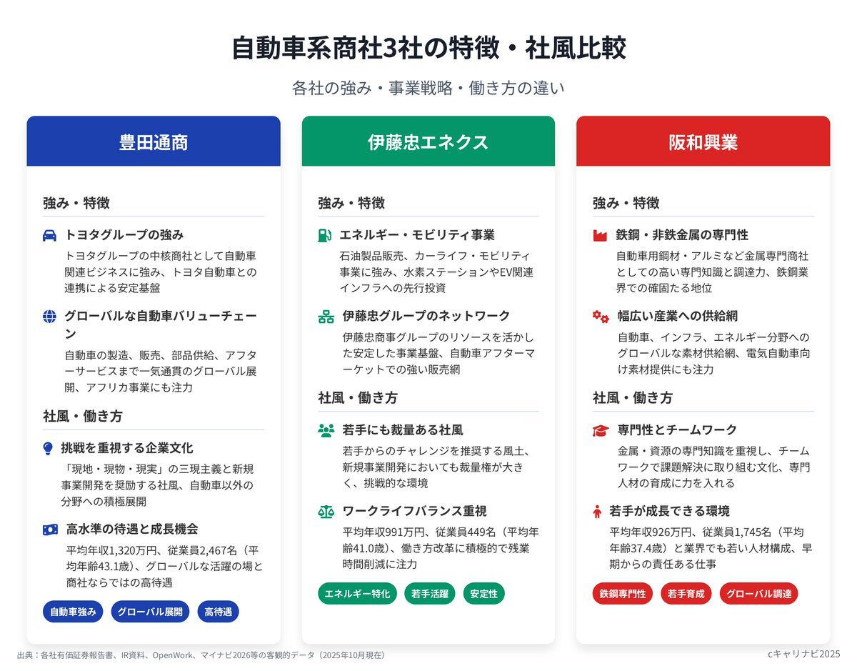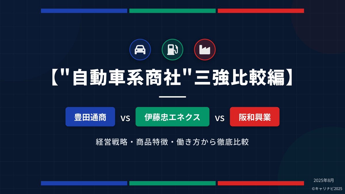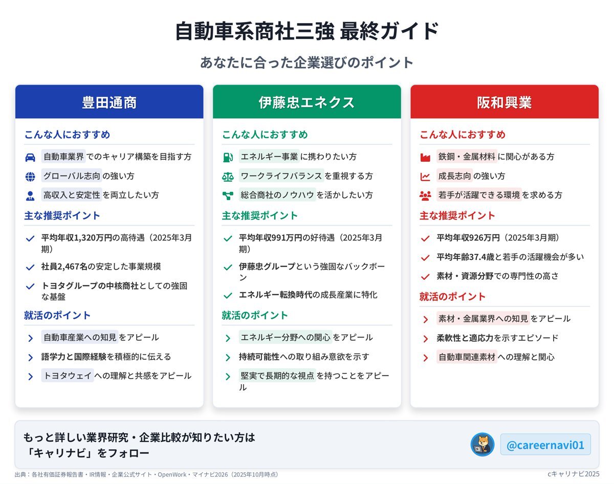 【豊田通商 vs 伊藤忠エネクス vs 阪和興業】 “自動車系商社”三強のリアルを1分で👇 トヨタグループの安定力、エネクスの成長戦略、阪和の素材特化。 年収・事業領域・働き方で分かれる三者三様の強みとは? #企業研究 #27卒 #就活 #商社 pic.x.com/FAGg1xivSg