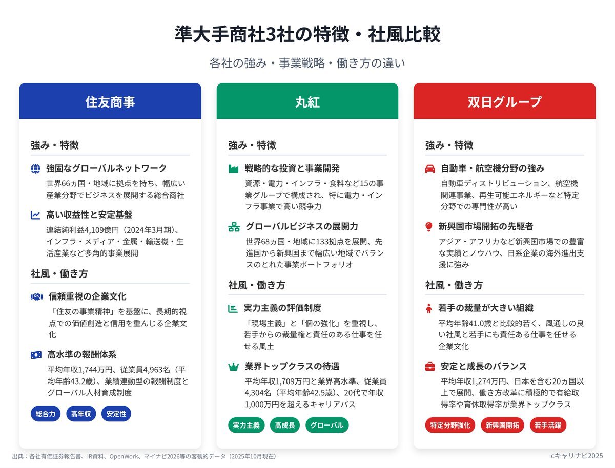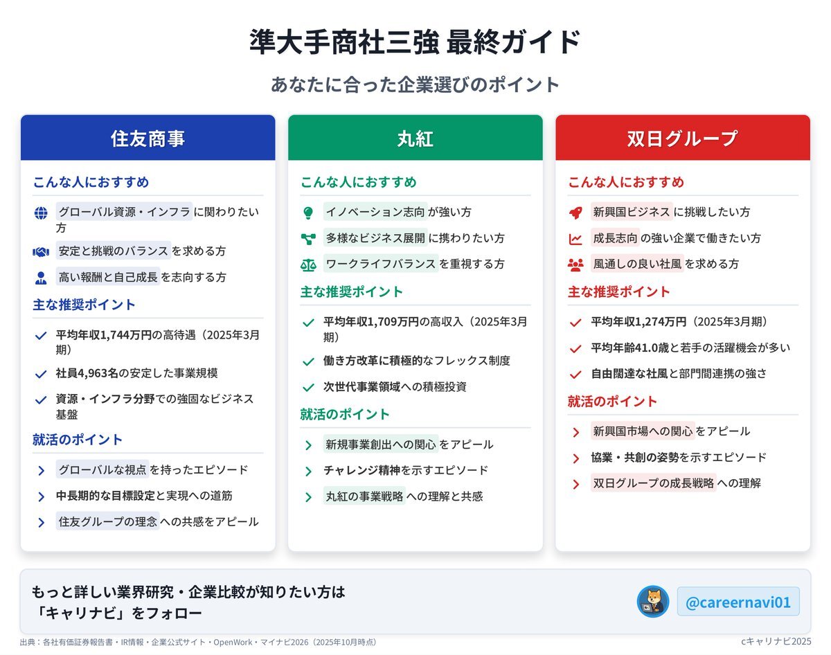 【住友商事 vs 丸紅 vs 双日】 “準大手商社三強”のリアルを1分で👇 選ぶのは安定?挑戦?裁量? #企業研究 #27卒 #就活 #商社 pic.x.com/UDGk6YDdbI