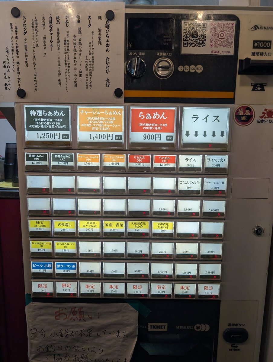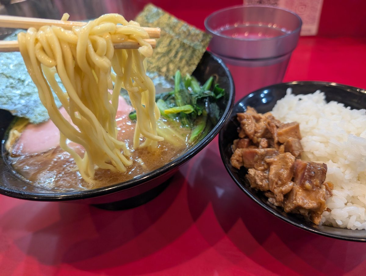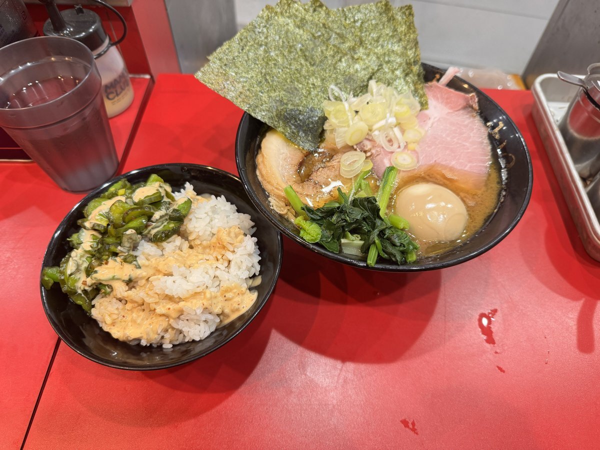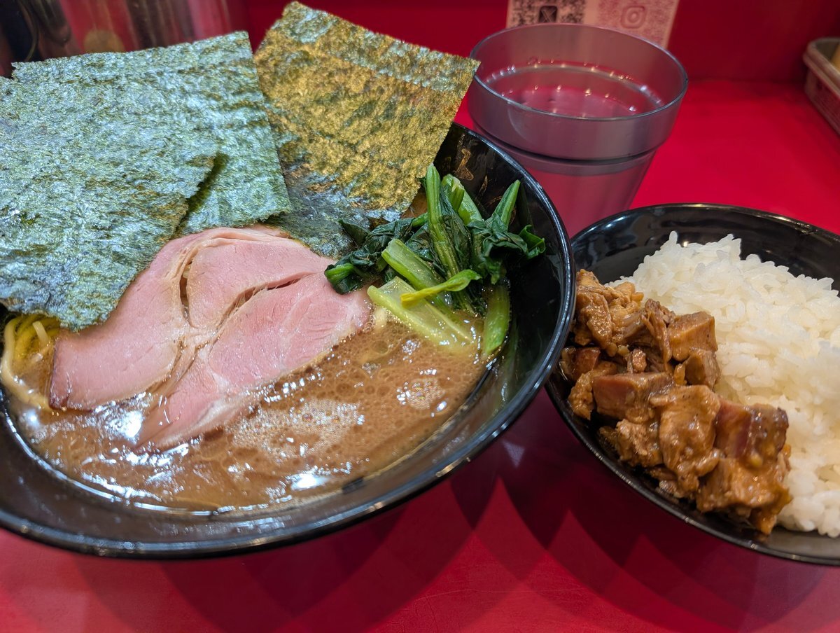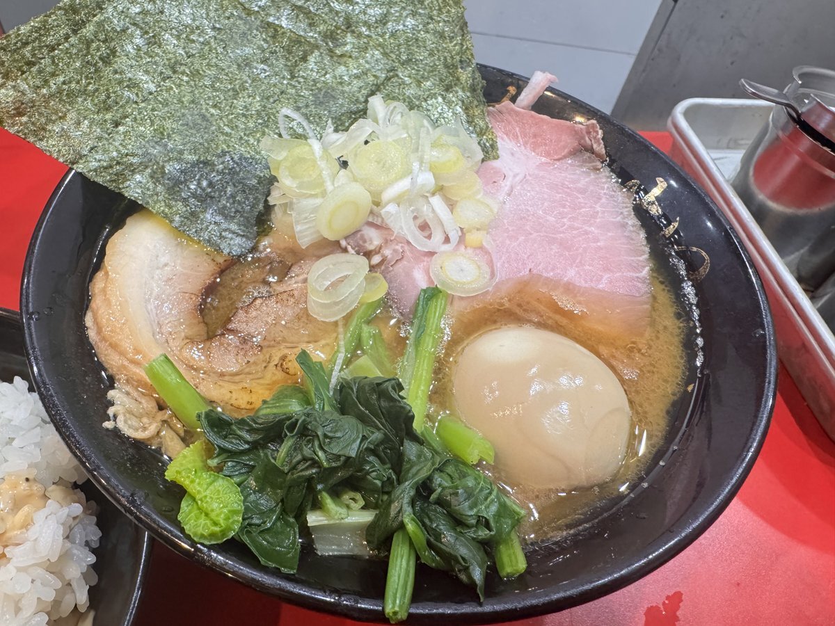 らぁめん:炭火焼き肩ロース1枚 のり3枚・青菜  お好み:麺かため、味うすめ、鶏油ふつう ライス ごはんのお供 #四ツ谷 #駅前 #ラーメン #家系 #立喰い #らぁめん #たいせい #酒井製麺 pic.x.com/qqMZxQV5TH