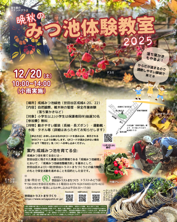 \参加者募集中/ 🍂晩秋のみつ池体験教室🍂 📅 12/20(土) 10:00〜14:00 📍 成城みつ池緑地 無料|小学生以上|抽選30名 📝 締切 :12/3 🔗 申込 : e.cnz.jp/sv/77w5/PHR7rL… お問合せ:#世田谷トラストまちづくり #世田谷 #成城 #みつ池 #体験教室 #成城みつ池を育てる会 #国分寺崖線 #里山保全 pic.x.com/QnUmT5tIUh