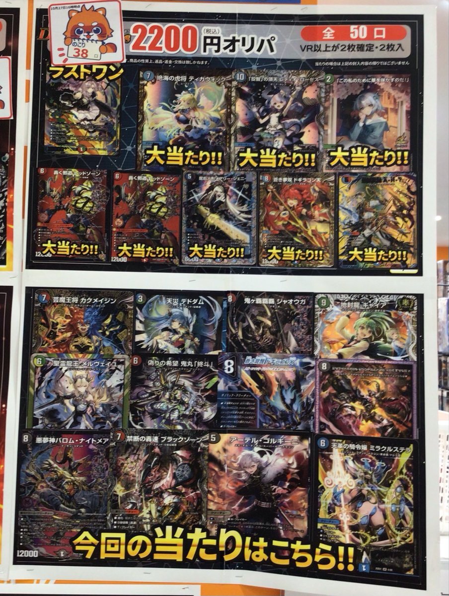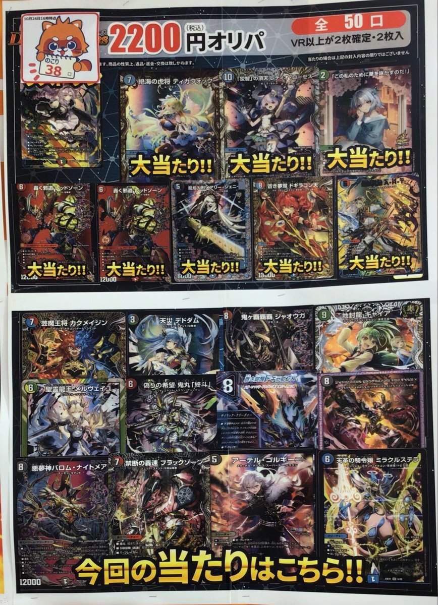 🌟今日のオリパ🌟 #デュエル・マスターズ オリパ 1回 2200円 全5️⃣0️⃣口/残り3️⃣8️⃣口 VR以上2枚入り 大当たり 『#絶海の虎将ティガウォック』『#狡智の頂天レディオ・ローゼス』 ラストワン 『#ミリオンブレイブ・カイザー』 当り枚数20/50枚‼️当り率🆙‼️ #ふるいち #イオンモール #土岐 pic.x.com/HevuPfdxkU