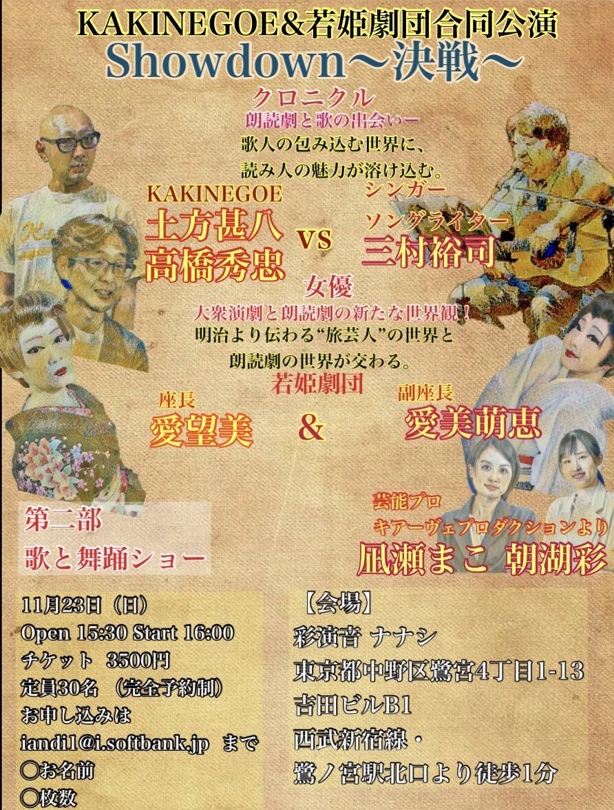 . 11月23日(日)🕊️ Open 15:30 Start 16:00 鷺ノ宮・表現集団KAKINEGOE 若姫劇団合同公演 「クロニクル」 朗読劇VS歌 高橋秀忠、土方甚八(KAKINEGOE) VS 三村裕司 「女優」 朗読 vs 旅芝居! 若姫劇団座長愛望美&副座長愛美萌恵 大衆演劇と朗読劇のmixACT! 新たな世界観! 作・演出 平山陽
