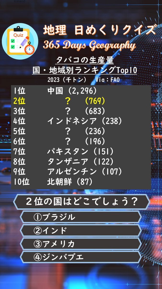 クイズ:タバコの生産量 2位の国はどこでしょう? 選択肢は ①ブラジル ②インド ③アメリカ ④ジンバブエ これは紙巻き、葉巻用両方のタバコの葉(つまり、未加工のもの)の合計値になっています。 正解は後ほど、リポストで投稿します。 #地理 #クイズ #地理日めくりクイズ #共通テスト #統計 pic.x.com/OSZ5OHH2Fj