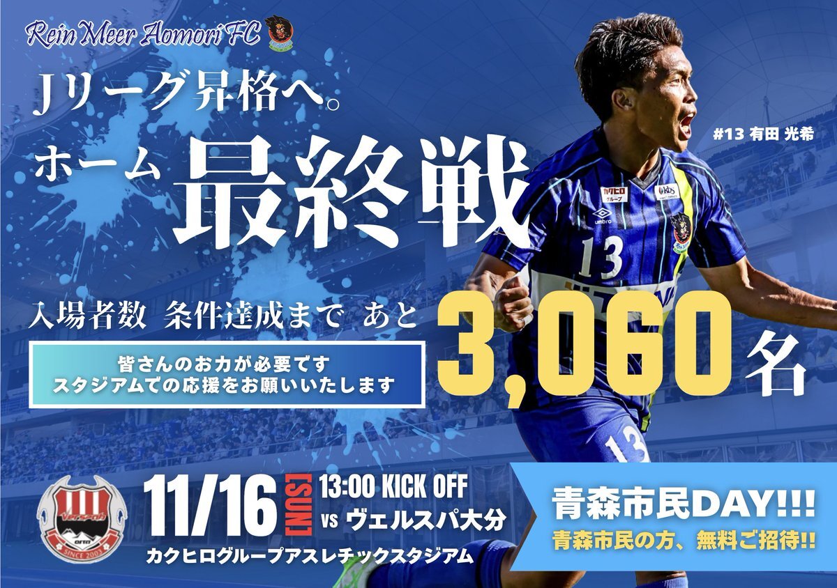 ホーム最終戦。 昇格条件達成には、3,060名のご来場が必要です🚨 スタジアムでの応援をお願いいたします🔥 ◤LAST HOMEGAME◢ 【#JFL 第29節 HOME】 🗓11/16(日)13:00 KICKOFF 🆚#ヴェルスパ大分 🏟カクヒログループアスレチックスタジアム 試合情報🆙✨ reinmeer-aomori.jp/post-38822/ #ラインメール青森