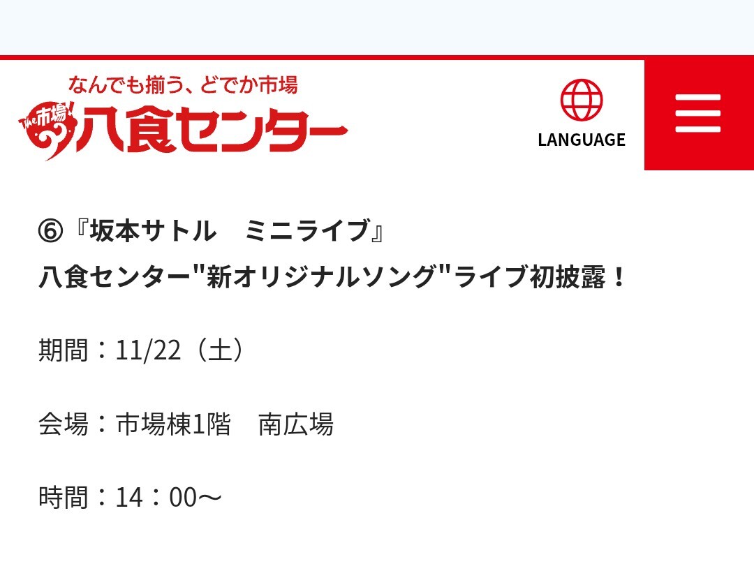 1週間早いですけど告知🤭 八食センター 創業45周年 大創業祭! 11/22(土) 14:00~ 坂本サトル ミニライブ 新オリジナルソング ライブ初披露! (市場棟1階 南広場) #八食センター #坂本サトル pic.x.com/GrR2l7lkzt