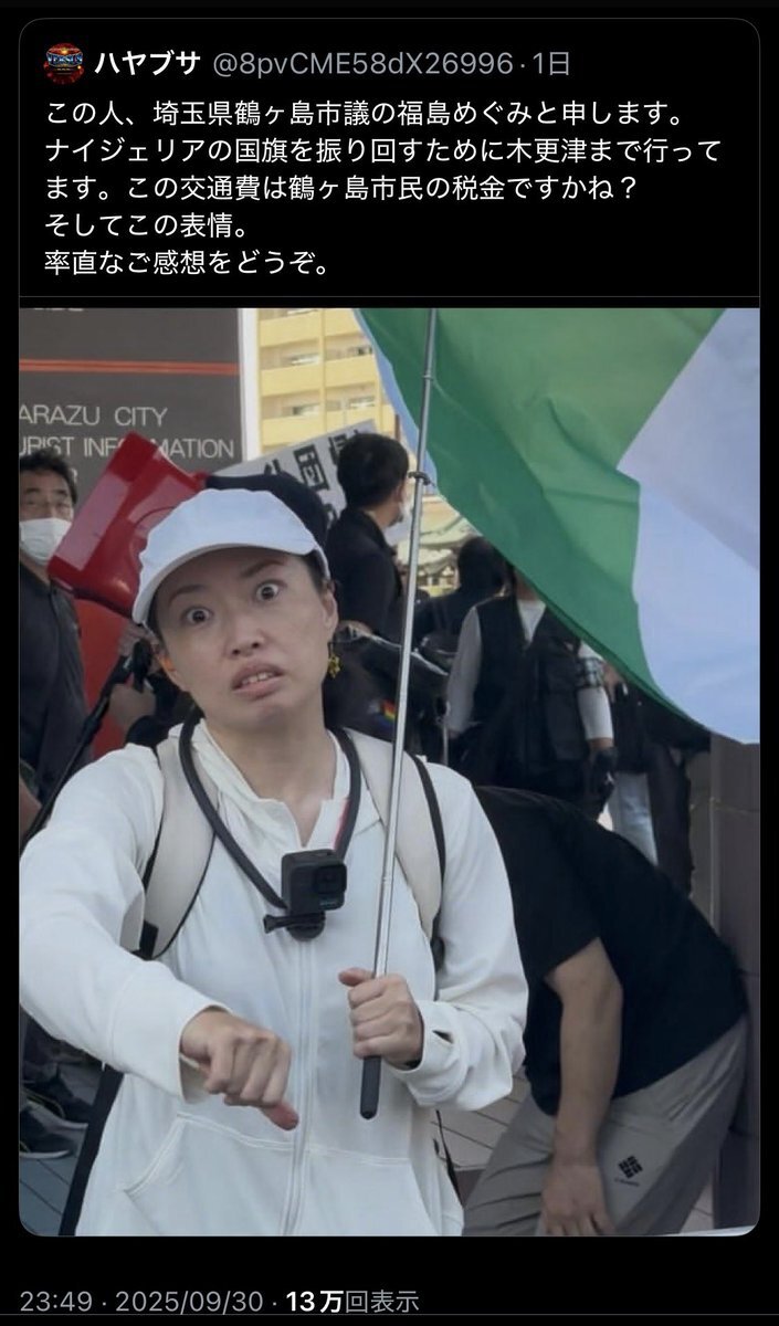 木更津デモに行った時、謎にナイジェリア国旗振り回してる人いるな…と思ってたけどこの人だったんか!!!? 記憶が定かではないが…そこそこデカいナイジェリア国旗だった。 ところで、彼女おてて👎してる…? 市議不適格なんじゃないか…? x.com/8pvcme58dx2699…
