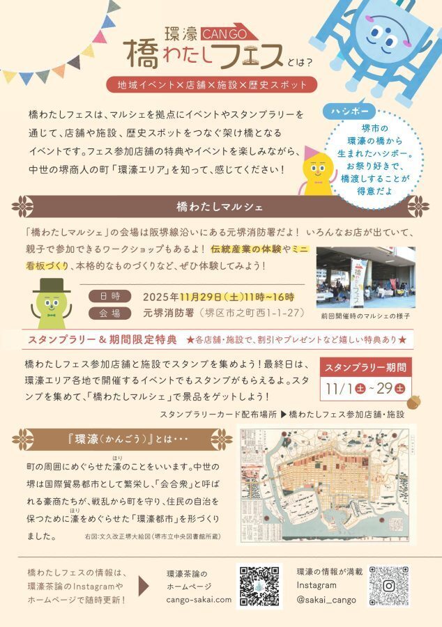 【堺市】「第5回環濠-CANGO-橋わたしフェス」開催中! machitto.jp/sakaisemboku/1… スタンプラリーに参加して環濠エリアを周遊しよう! 環濠エリアの人気店をはじめ、グルメや雑貨など多彩なお店が大集合✨ マルシェや縁日など同日開催イベントも楽しんで🎶 #堺市 #堺市堺区 ※画像は全て主催提供 pic.x.com/SH5U5pHqmJ
