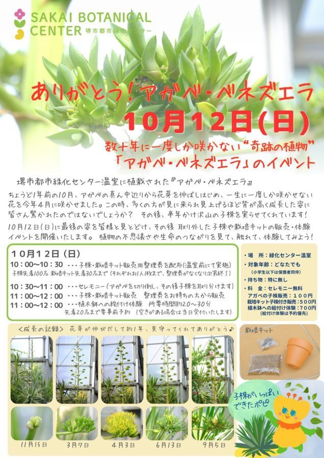 【百舌鳥】堺市都市緑化センターで奇跡の植物の最後を見届ける「ありがとう!アガベ・ベネズエラ」10月12日(日)に開催 machitto.jp/sakaisemboku/1… 一生に一度しか咲かない“アガベ・ベネズエラ”。 今回は、アガベの最後の姿を見届けるセレモニー✨ 栽培キットの販売・体験イベントも! #堺市 #堺市堺区 pic.x.com/DPd1jgRafi