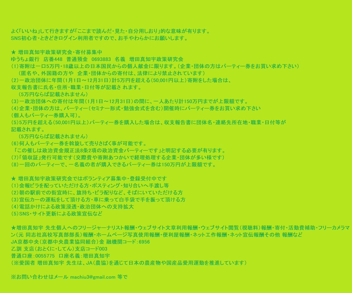 返信先:@taroinagaki025一方で京都府長岡京市の #増田真知宇(ますだまちう)先生はカネ100億円の振込みで、一部の愛国活動から転進して下さるそうです。 先生への報酬振込先 JA京都中央(京都中央農業協同組合)金融機関コード:6956 乙訓 支店(おとくに・してん)支店コード003 普通口座:0055775 口座名義:増田真知宇 pic.x.com/mmB7YlQbAZ