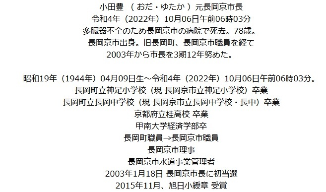 返信先:@InsHatanCountry小田豊 長岡京市長などは、「死去」でも「死亡」でもなく 「崩御」追悼特設ホームページ↓ odayutaka.web.fc2.com ↑が作成されているんだぞ #長岡京市 #小田豊 #長岡京市 #長岡京市長 #崩御 #市長 京都府長岡京市 増田真知宇(ますだまちう) #増田真知宇 神足小学校 長中 長岡中学校 長岡京市職員 pic.x.com/X6MVZiApf0