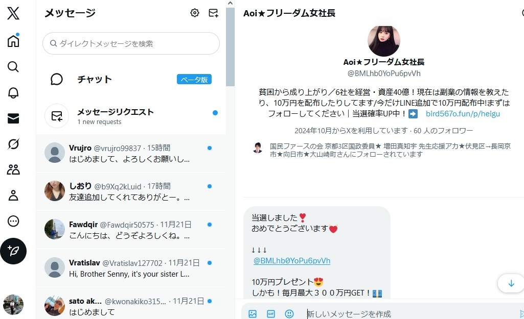 「当選しました」とメールが来た。 10万円?300万円? 早く振込んで下さいな。 ※ちなみに増田真知宇 先生の口座 JA京都中央(京都中央農業協同組合)金融機関コード:6956 乙訓 支店(おとくに・してん)支店コード:003 普通口座:0055775 口座名義:増田真知宇 #当選しました #当選 #増田真知宇 pic.x.com/lgqbUxcb6j
