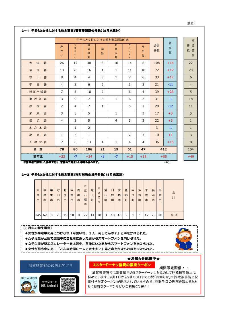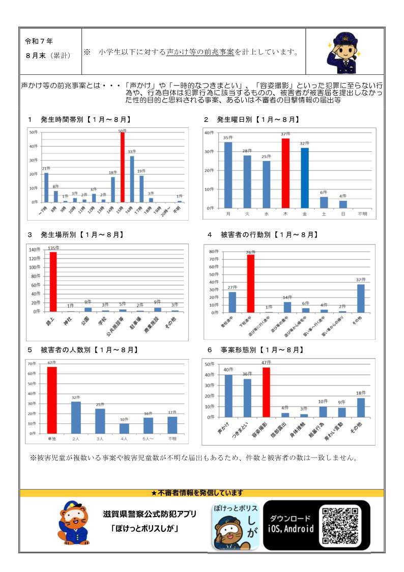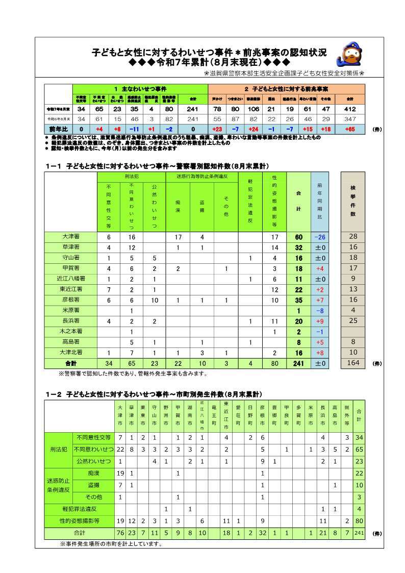 わいせつ事件・子どもと女性に対する前兆事案の認知状況 R7.8月末☆ 【#生活安全企画課#子ども #女性 #声かけ #つきまとい #犯罪 #前兆事案 性に関する対象事件・子どもと女性に対する前兆事案の認知状況は、ホームページにも掲載されています。 pref.shiga.lg.jp/police/seikatu… pic.x.com/T2Zh2QEQpE