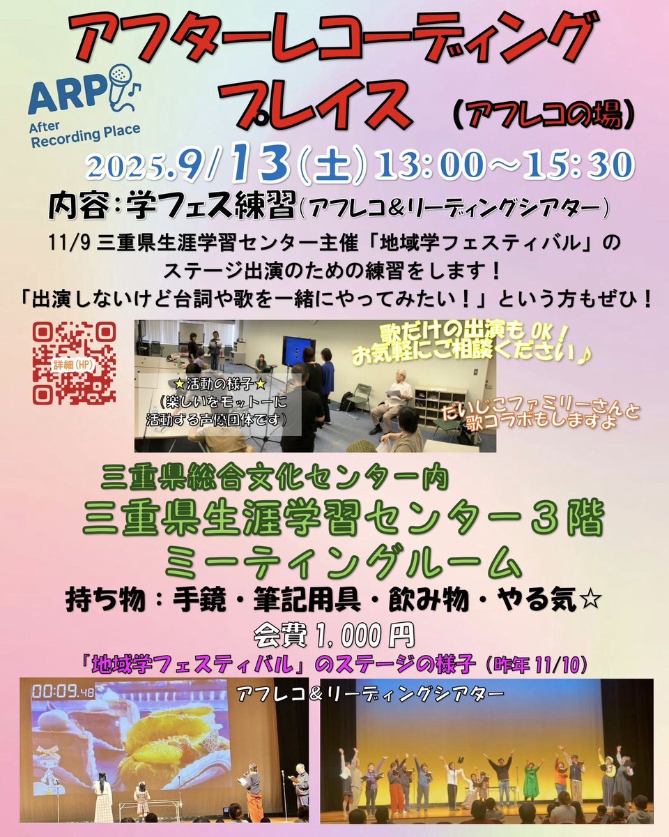 【今月の予定】 9/13(土) #津市 #アフターレコーディングプレイス 11/9のステージ練習🎤 9/21(日) #豊田市 #声優塾inとよた 内容: #アフレコ 🗣️📄 9/27(土) #名古屋市 #声優による表現力アップ講座 第5期スタート❗️ 内容:講師と台詞の掛け合い🧑🏻🏫 申込はHPの「お問い合わせ」からぜひ🍀