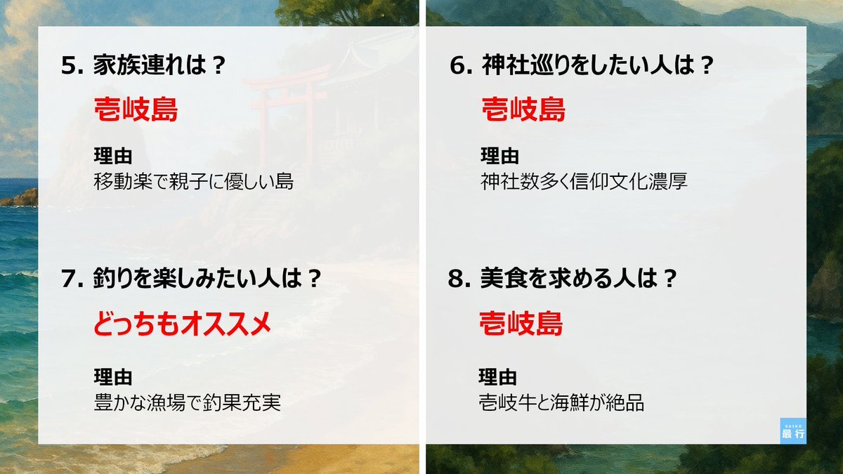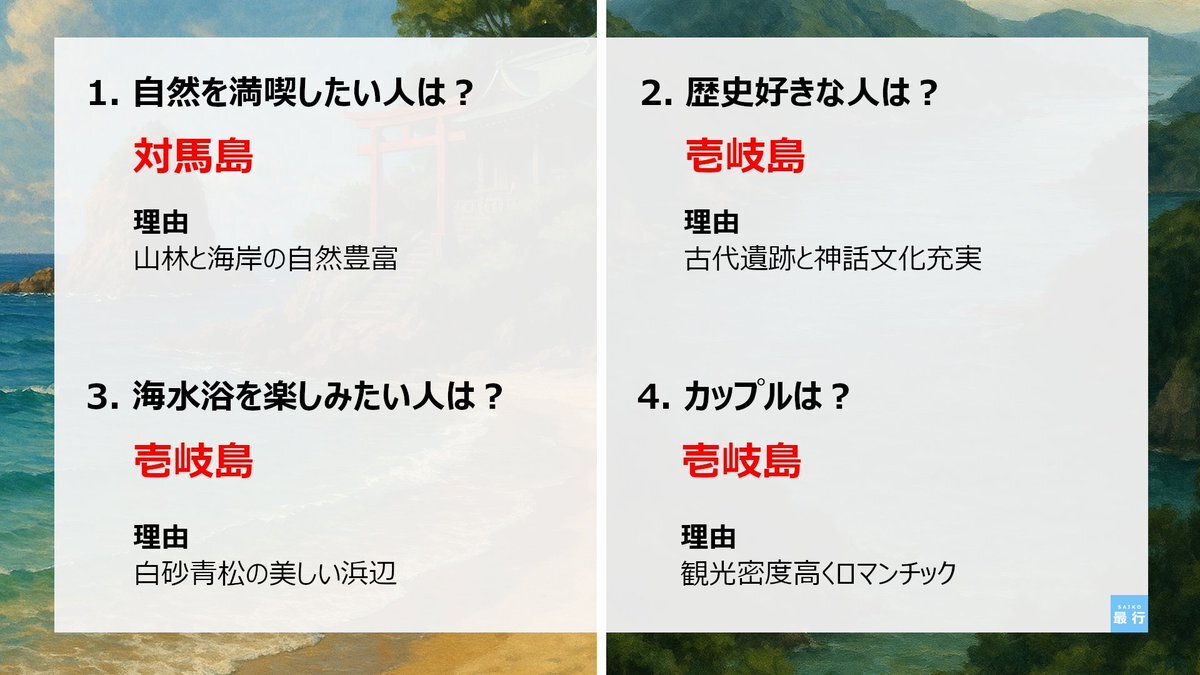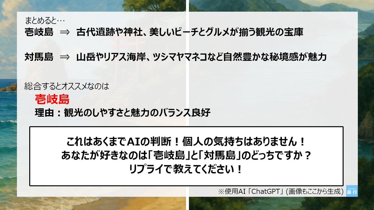 【どっちがオススメかAIに聞くと?】「 #壱岐島 」と「 #対馬島 」の場合 10視点から総合的に評価! あなたがしたいことは何?同行者は誰? またあなたはどっちが好きですか? リプライで教えてください! #旅行好きな人と繋がりたい #旅行 #観光 #AIに聞いた ※過去投稿アップデート pic.x.com/wt43A4hUxZ