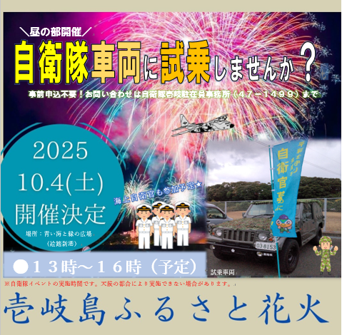 #壱岐所 からのお知らせ🌞】 海自×地本 合同企画✨part② ☆10月4日(土)13時~16時 青い海と緑の広場(絵踏新港)で開催されるふるさと花火の前に自衛隊イベントを実施! 車両の試乗も予定しておりますので、是非お立ち寄りください! 詳細は画像をチェック✅ #長崎地本 #壱岐島 #海上自衛隊 #花火 pic.x.com/XZ5ECC9aY4