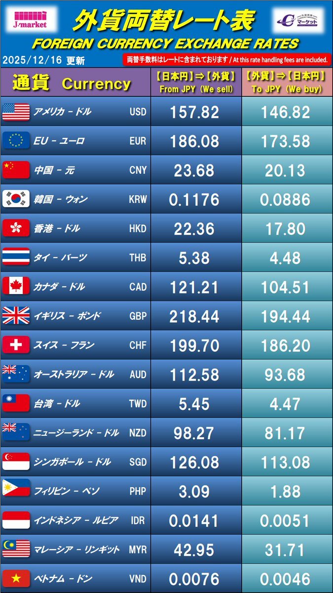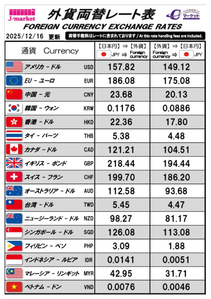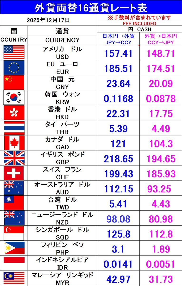 外貨両替レート表、更新いたしました。 2025年12月16日 #トーカイ円町店 は、本日も19時半まで営業しています。 #トーカイ外貨両替レート #外貨両替 #京都 #ドル #ユーロ pic.x.com/z2Xz0O2gS4