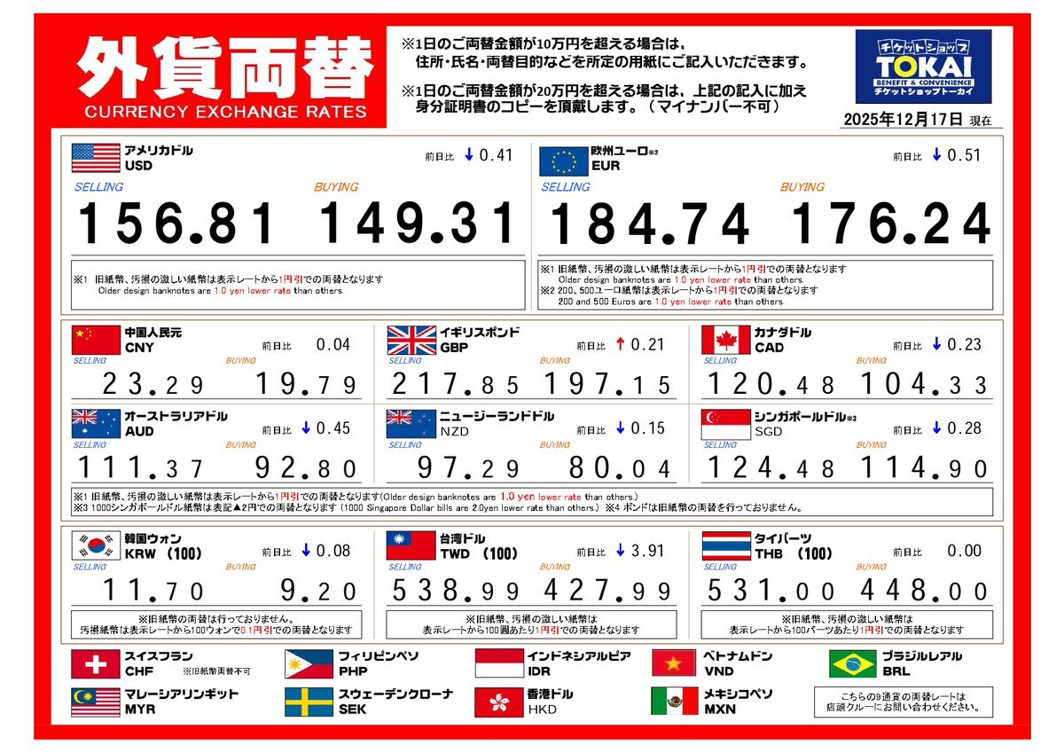 外貨両替レート表、更新いたしました。 2025年12月17日 #トーカイ円町店 は、本日は18時半までの短縮営業となります。 #トーカイ外貨両替レート #外貨両替 #京都 #ドル #ユーロ pic.x.com/QSuUlf1KqI
