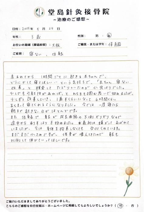 <患者様のお声をご紹介!> 【夜泣き・成長線が下の方】 0歳の頃より通院いただいている〇ちゃん。 初診時は「夜泣き」が一番のお悩みで「小児はり(刺さないはり治療)からスタート。 一日中ぐっすり眠るようになりました☺ 続き>dojima-hari.com/voice-blog/110… #夜泣き #小児はり #大阪鍼灸 #梅田鍼灸 pic.x.com/cRugzfvWhf
