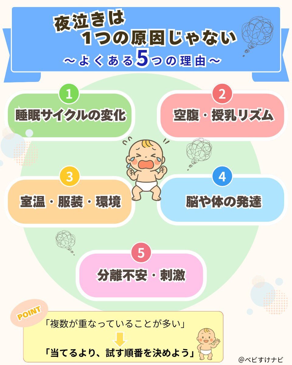 夜泣き=原因は1つじゃない😢 実は「いくつも重なっている」ことがほとんど。 ✔ 睡眠サイクル ✔ 空腹・授乳リズム ✔ 室温・服装 ✔ 脳や体の発達 ✔ 分離不安・刺激 👉 当てずっぽうより「順番に試す」がコツ。 保存して、夜泣きのときに見返してね👇 #夜泣き #育児あるある #0歳育児 pic.x.com/19pGz831WX
