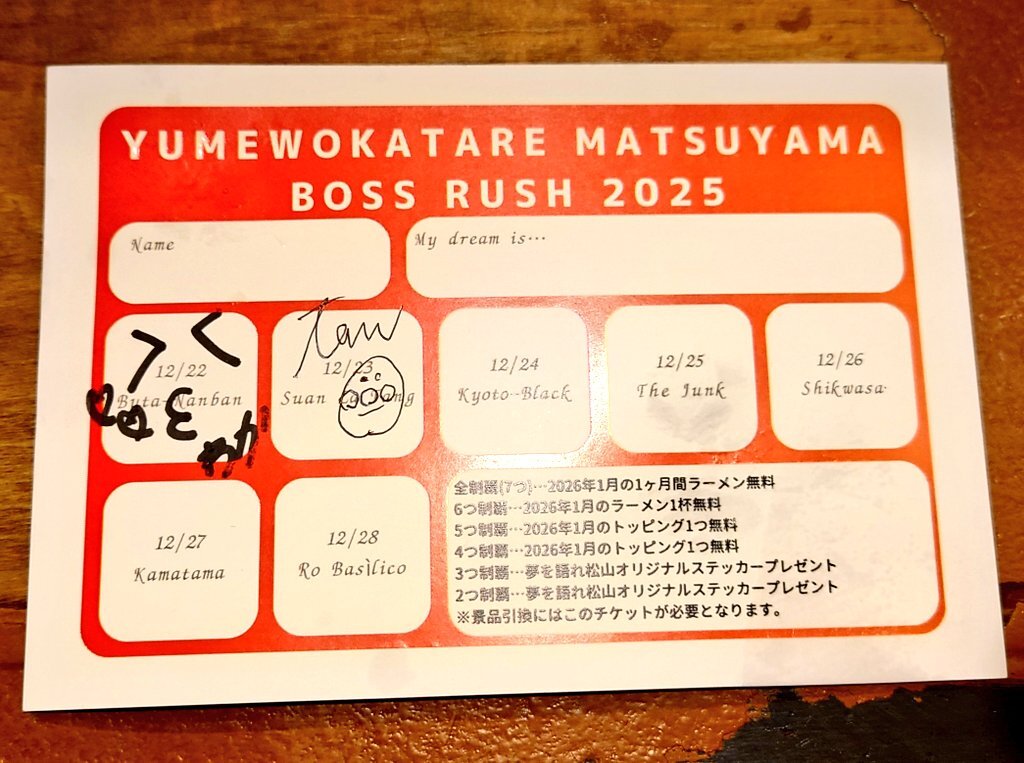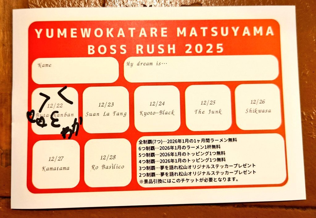 夢を語れ松山 Boss Rush 2025 Day.2 2日目は酸辣湯麺🍜 酸味と辛味とコショウ!って感じのラーメンだけど酸味も辛味も自分的にはちょうどよくて意外にスルスル食べれて美味しかった🥰 外は寒かったのに酸辣湯麺食べたら汗だく🤣 店内BGMのUVERworldも良かった🤭💕 #夢を語れ #夢を語れ松山 pic.x.com/1K0001kZYF