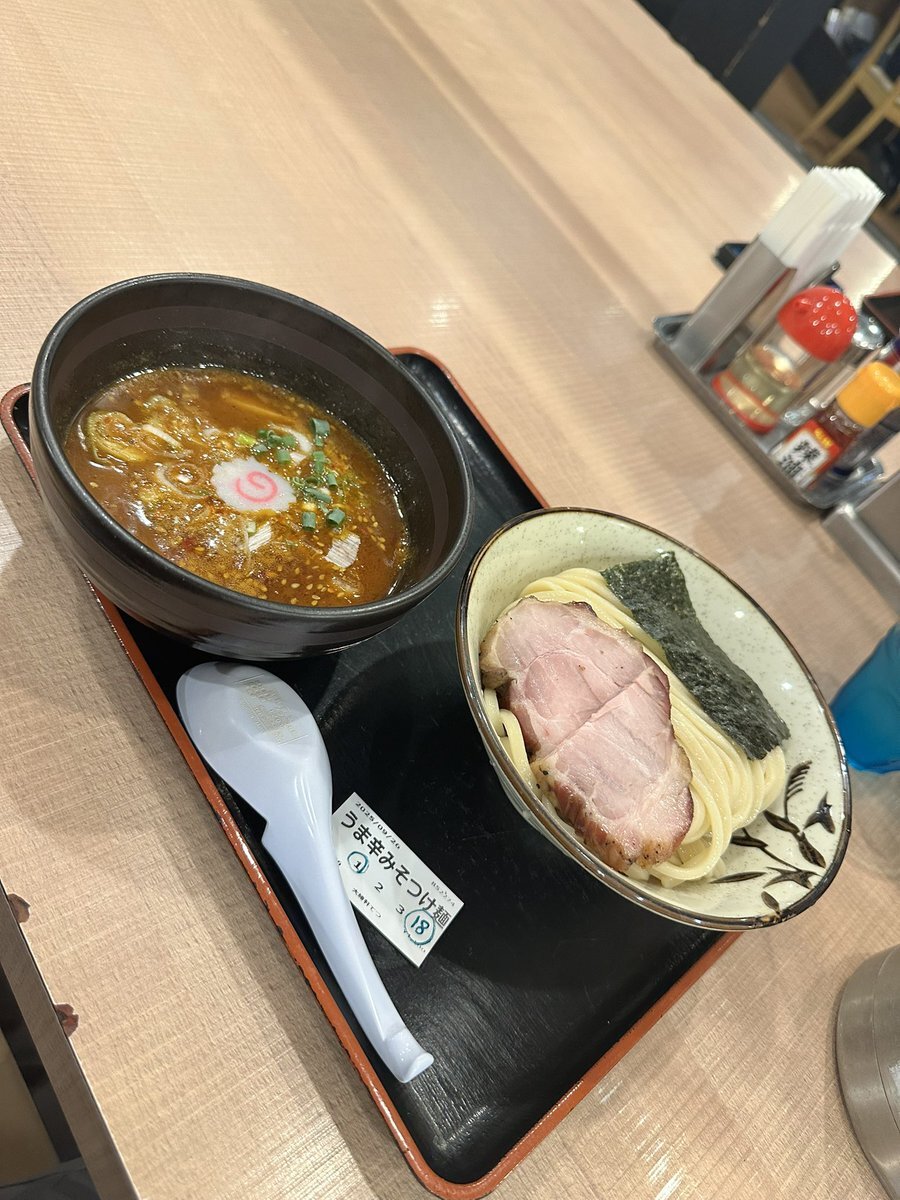 最近みんながラーメンポストするから我慢出来ずに昨日ラー活しちゃった🍜 ここの辛つけ麺好きなんだよね😋 3辛まであるけど1辛で十分。 2辛でも辛くて汗だく💦 #大勝軒てつ pic.x.com/Z1qsStBjje
