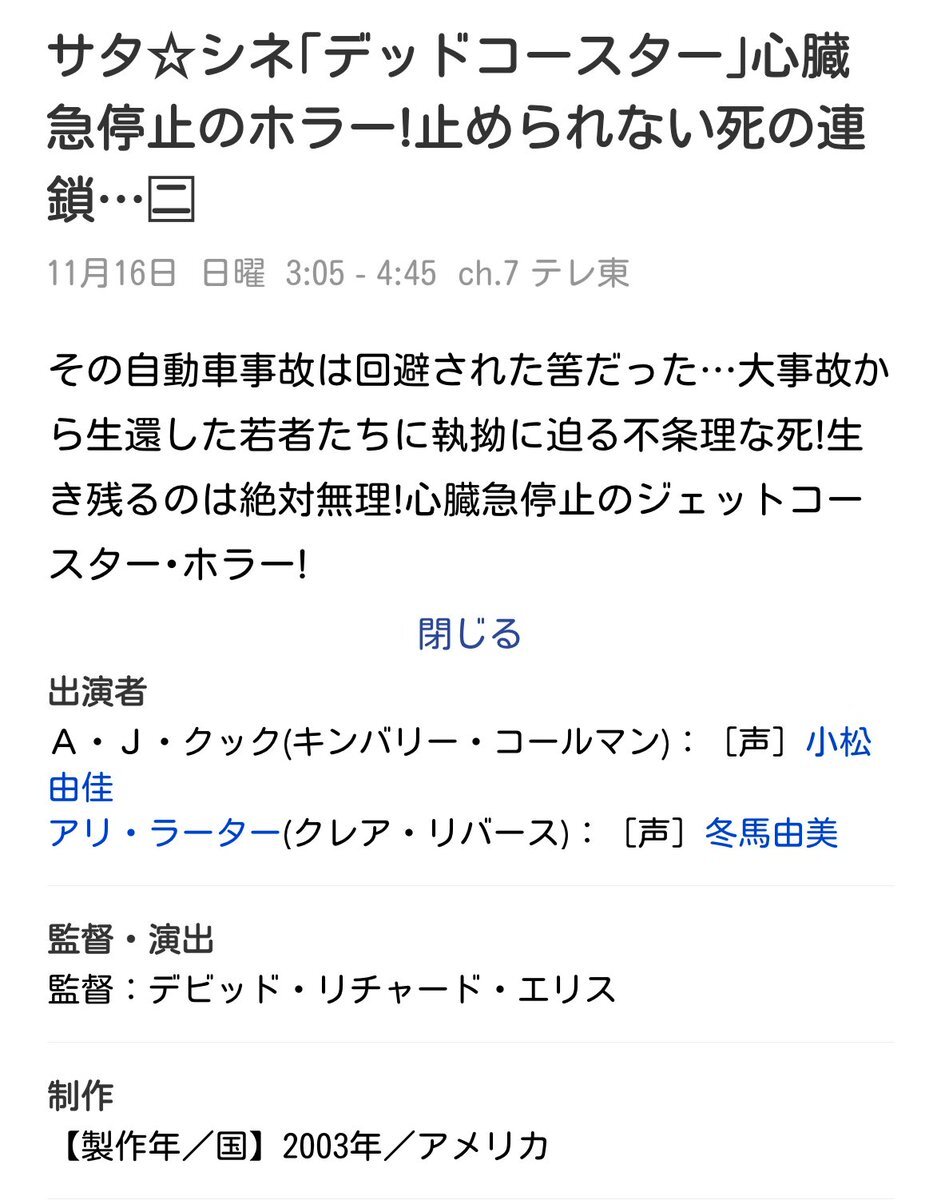 11月16日(15日深夜)放送のサタ☆シネ『デッドコースター』の吹き替えは【テレビ東京版】による放送となります。 【声の出演】 #小松由佳 #冬馬由美 #宮本充 #西凜太朗 #大塚明夫 pic.x.com/56tnbnAWw8