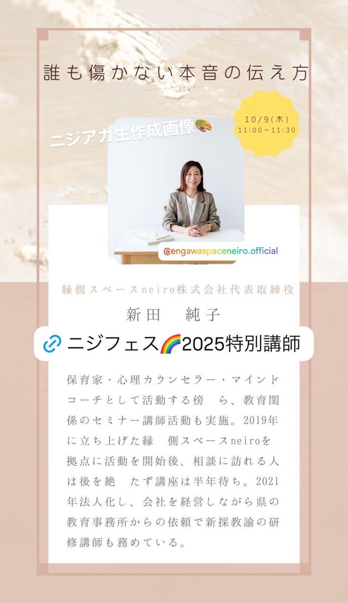 特別授業WEEKはDAY 4へ続く🌈 【今後の登壇者紹介】 🧑🏫 新田純子さん #大学講師 縁側スペース #neiro instagram.com/engawaspacenei… ⏰ 10/9(木)11:00〜11:30 🖥️メタバース会場 📝授業内容「誰も傷かない本音の伝え方」 #ニジフェス2025 pic.x.com/seA7gnmQyp