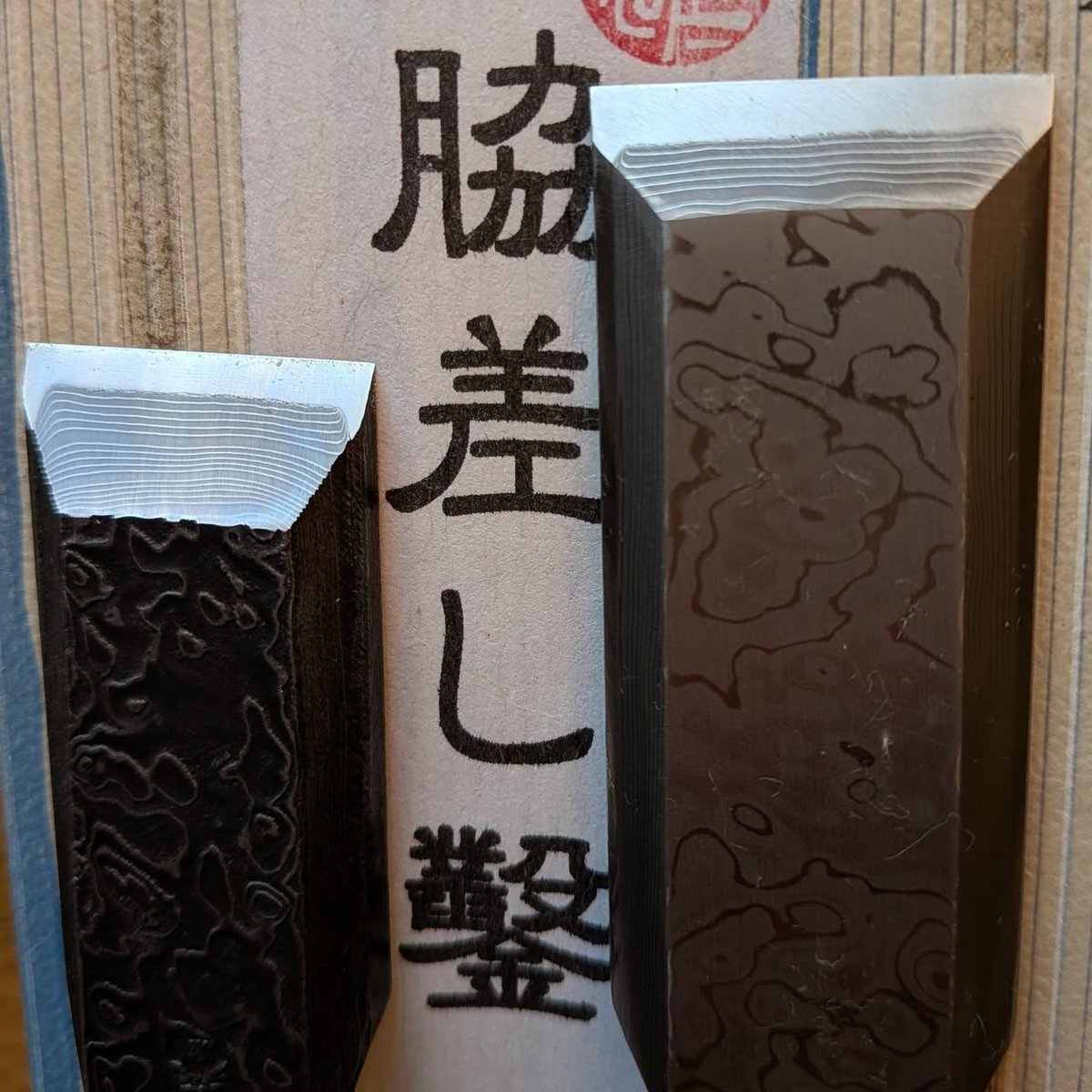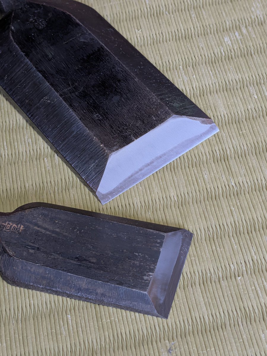 5年ほど愛用している田斎作 木目刃の脇差し鑿。(左側) ちょこちょこ研いでいたら、大分小さくなってきたので 刃の角度を浅く研ぎなおして、和室造作仕様にしてみた。 新品と並べてみる。なんか、刃先が斜めってるじゃん。研ぎ師より、俺のが上手くね?(笑) #道具道楽 #大工道具 pic.x.com/xZcW81rfjt